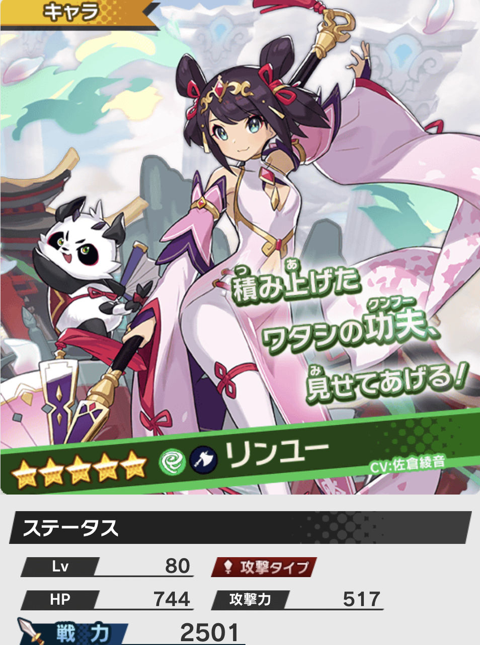 メリィベル、ホーク、ルイーゼと遠距離職続きだったので、リンユー実装による風属性近距離職がようやく充実することになります。