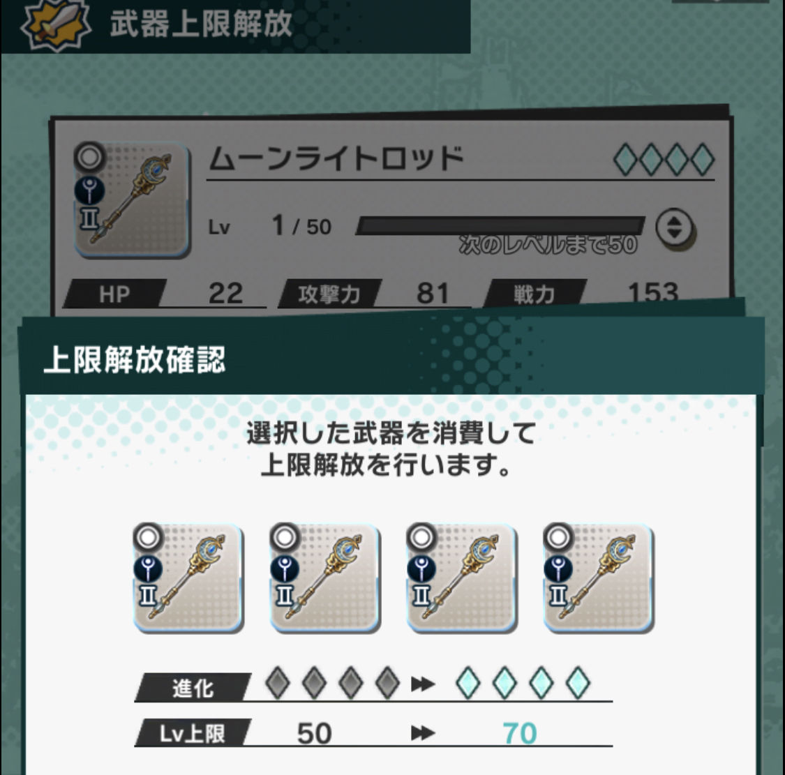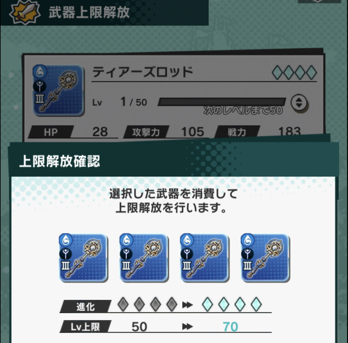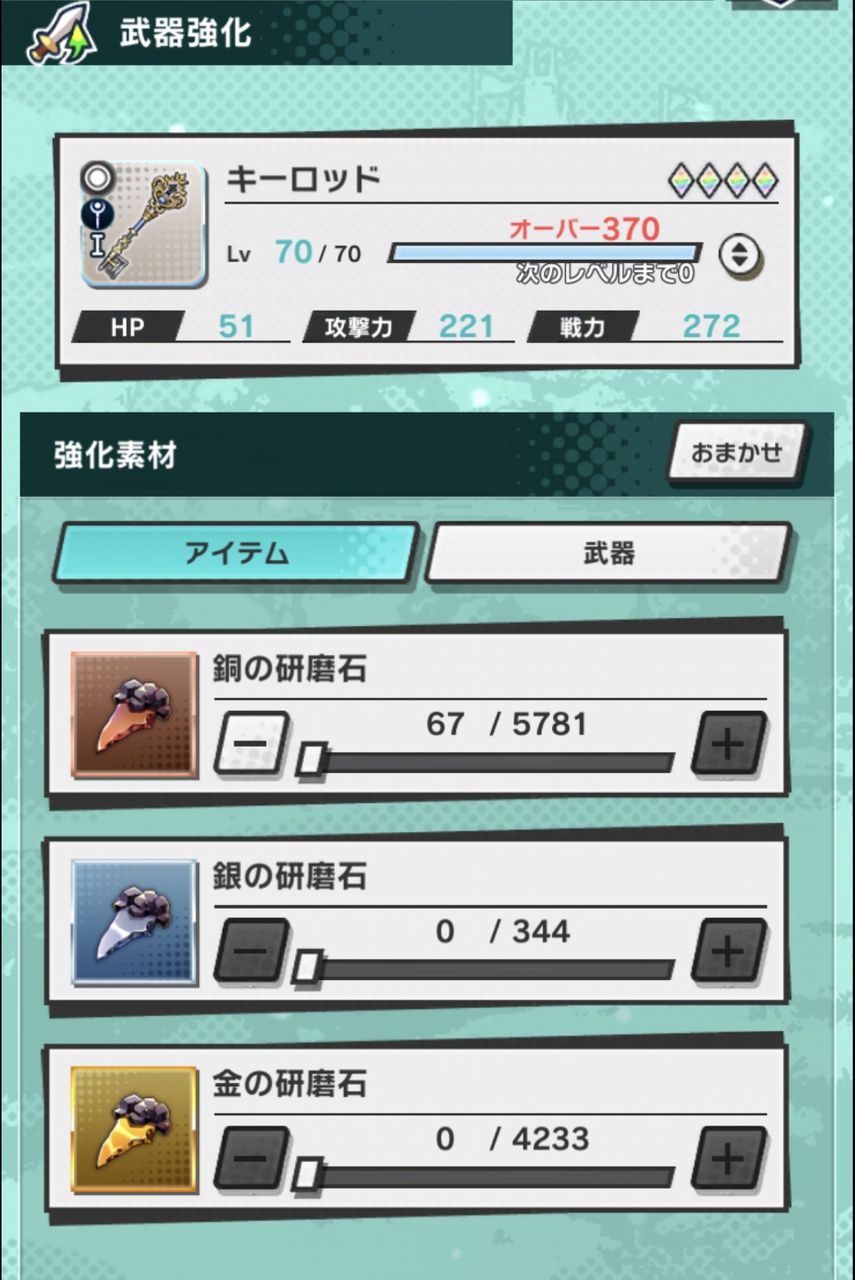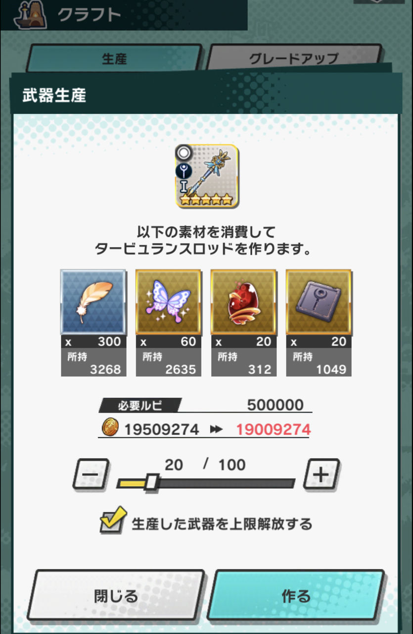 ティアーズロッドの方は、キーロッドを125本作って強化、上限解放し、ムーンライトロッドを25本作って強化、上限解放し、ティアーズロッドを5本作って上限解放!!