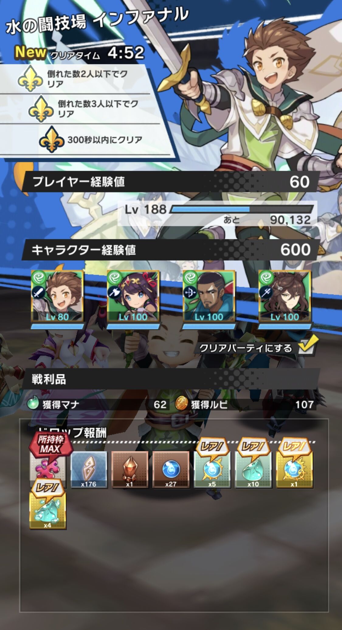 ただし、難易度インファナルともなると、アギト武器が解放されておらず、マナサ第6層解放キャラもザインフラッドとフィヨルムしかいない水属性パーティでは火力不足となり、クリアすることは可能でも300秒以内クリアのミッションを達成するのはかなり困難です。